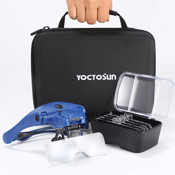 YOCTOSUN magnifying glasses offer 5 interchangeable lenses and 4 bright LED lights for detailed close-up work. Comfortable, hands-free design with adjustable headband and rechargeable battery ensures long-lasting use.